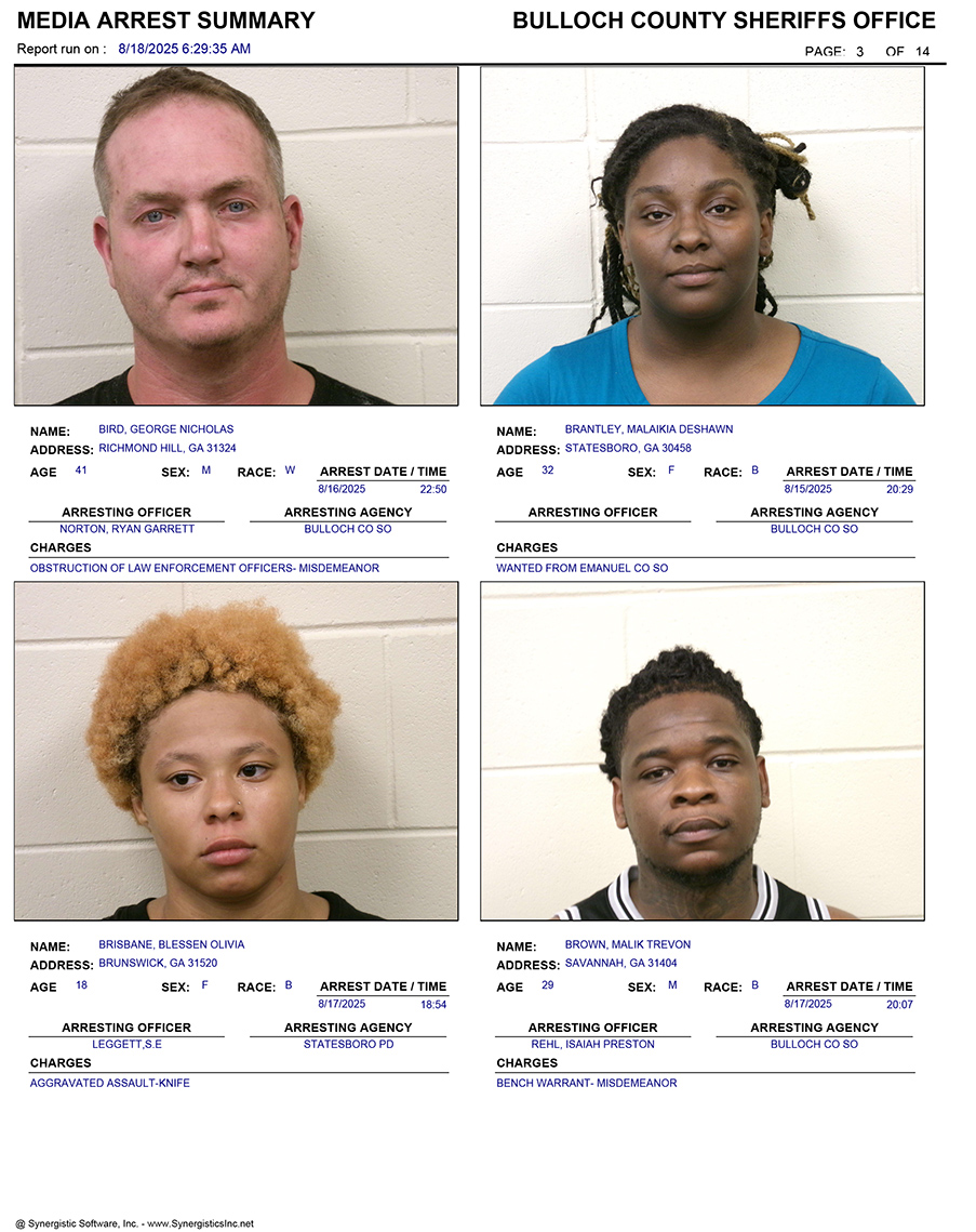 These records are matters of public information provided by the Bulloch County Sheriff’s Office. Booking reports are details of arrests only. All persons below are considered to be innocent unless proven otherwise in a court of law.