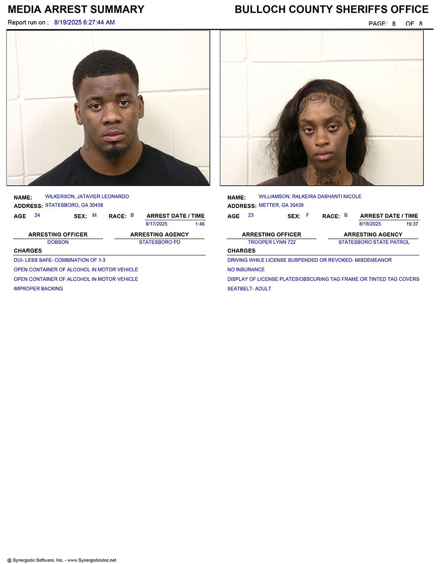 These records are matters of public information provided by the Bulloch County Sheriff’s Office. Booking reports are details of arrests only. All persons below are considered to be innocent unless proven otherwise in a court of law.