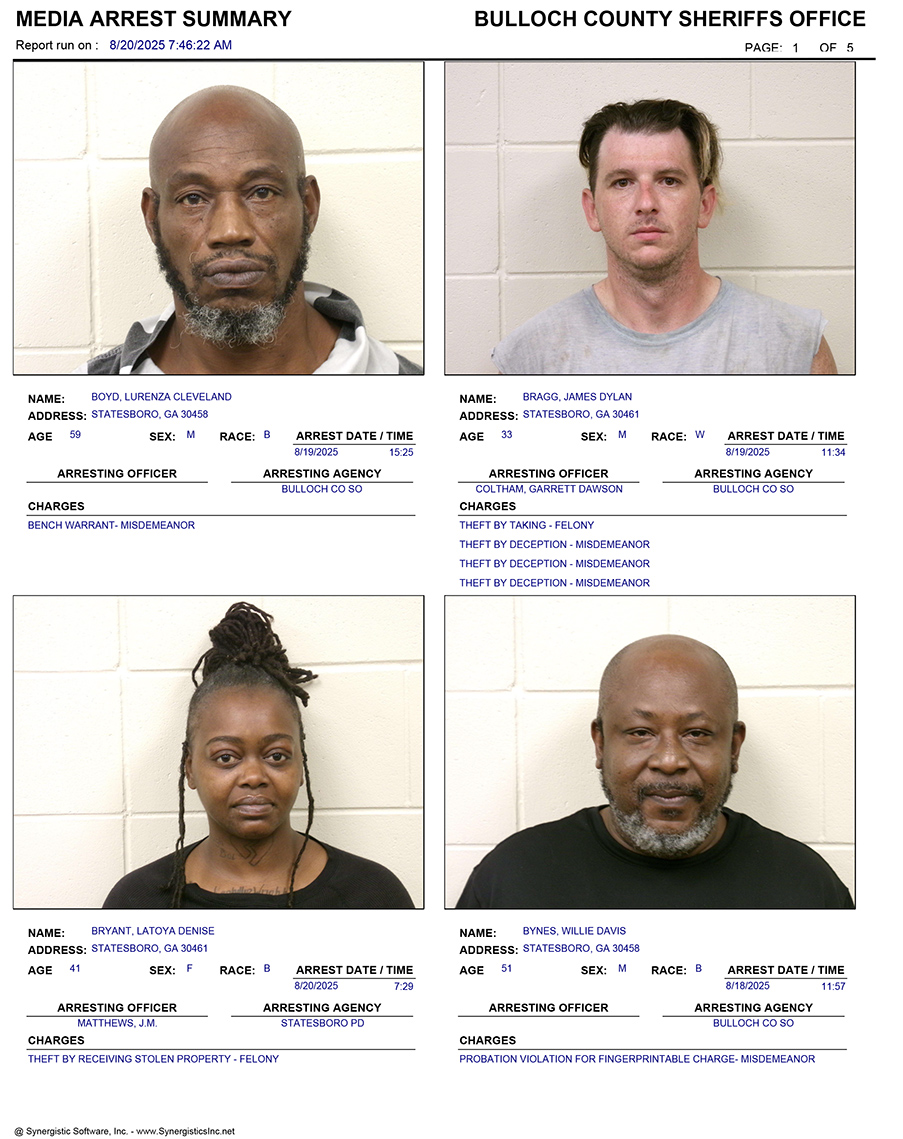 These records are matters of public information provided by the Bulloch County Sheriff’s Office. Booking reports are details of arrests only. All persons below are considered to be innocent unless proven otherwise in a court of law.