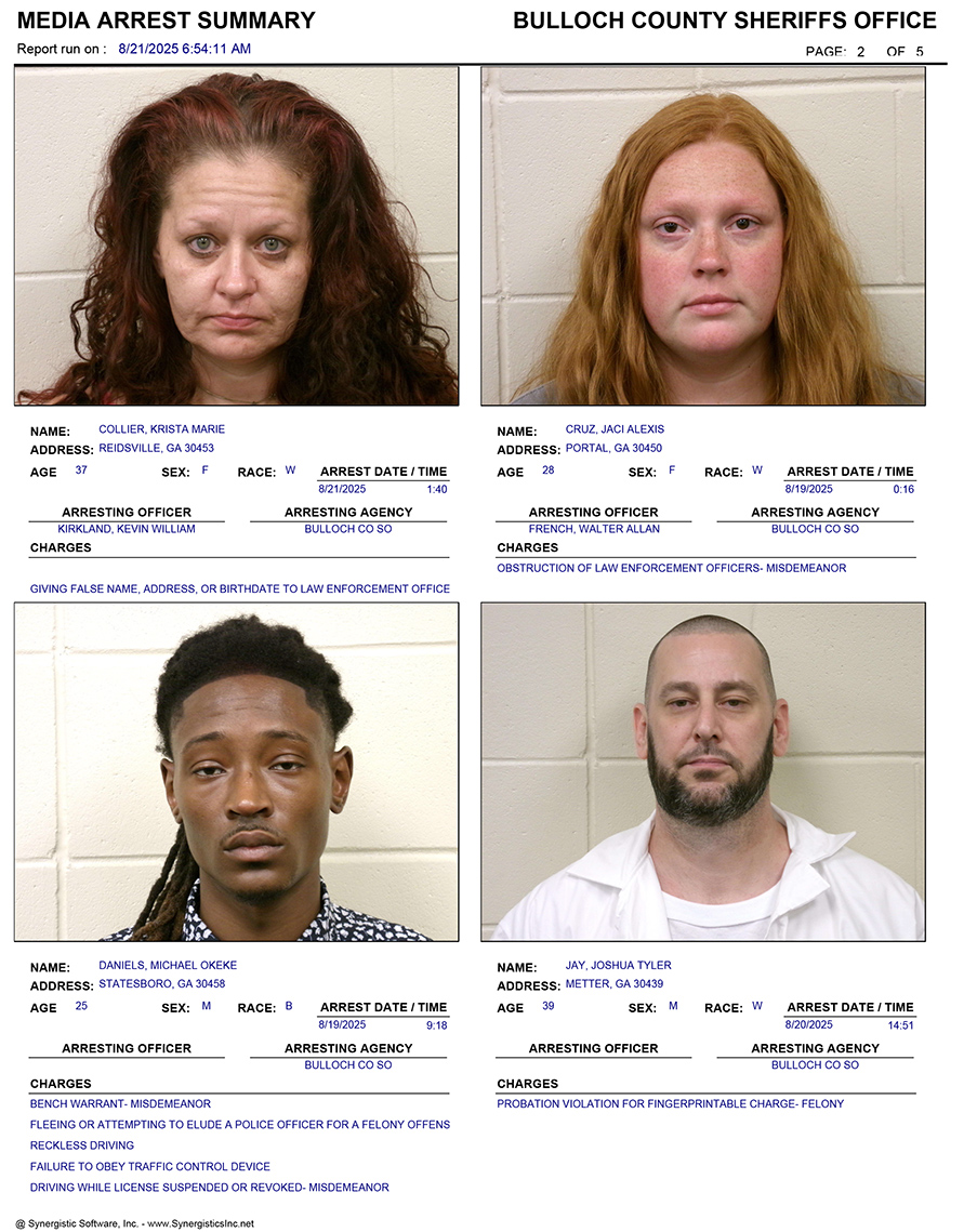 These records are matters of public information provided by the Bulloch County Sheriff’s Office. Booking reports are details of arrests only. All persons below are considered to be innocent unless proven otherwise in a court of law.