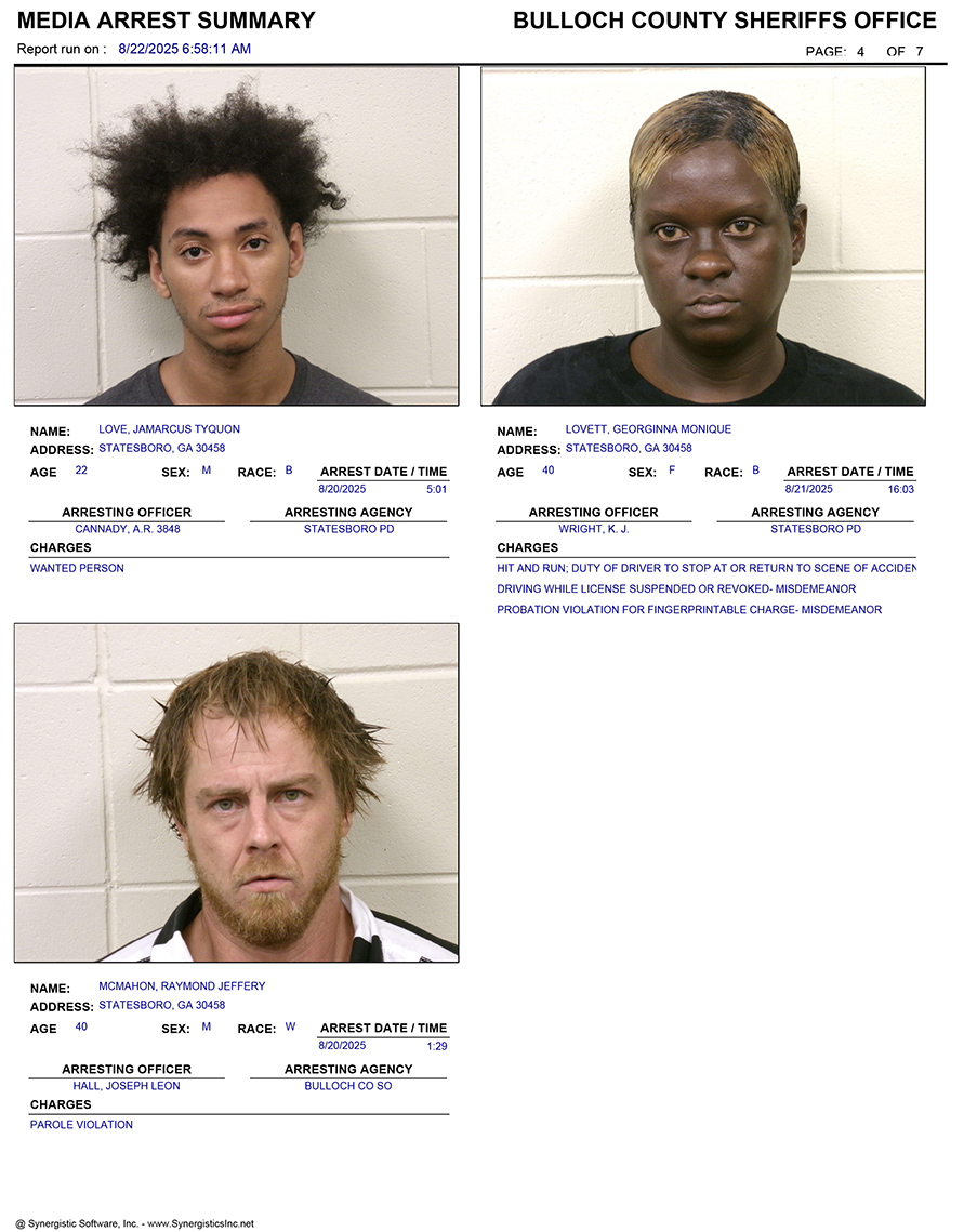 These records are matters of public information provided by the Bulloch County Sheriff’s Office. Booking reports are details of arrests only. All persons below are considered to be innocent unless proven otherwise in a court of law.