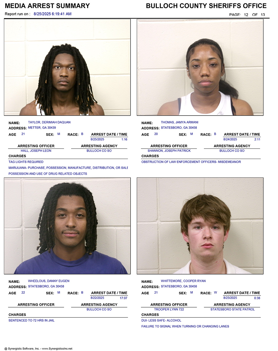 These records are matters of public information provided by the Bulloch County Sheriff’s Office. Booking reports are details of arrests only. All persons below are considered to be innocent unless proven otherwise in a court of law.