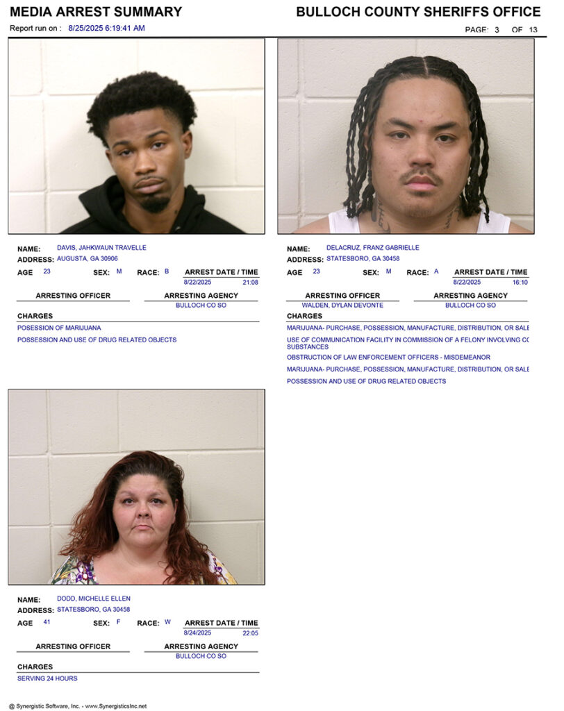 These records are matters of public information provided by the Bulloch County Sheriff’s Office. Booking reports are details of arrests only. All persons below are considered to be innocent unless proven otherwise in a court of law.