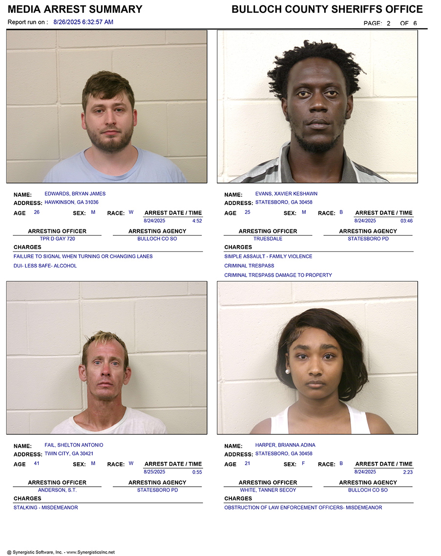 These records are matters of public information provided by the Bulloch County Sheriff’s Office. Booking reports are details of arrests only. All persons below are considered to be innocent unless proven otherwise in a court of law.