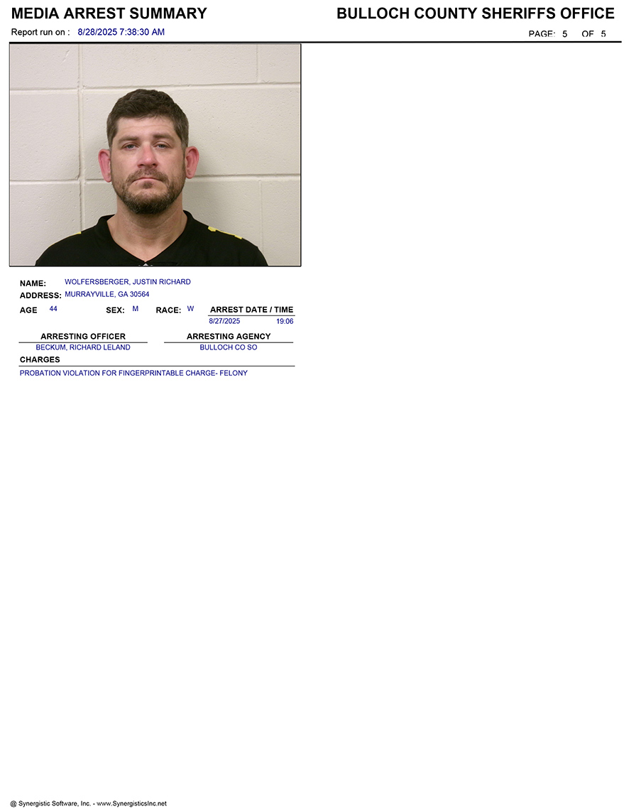 These records are matters of public information provided by the Bulloch County Sheriff’s Office. Booking reports are details of arrests only. All persons below are considered to be innocent unless proven otherwise in a court of law.