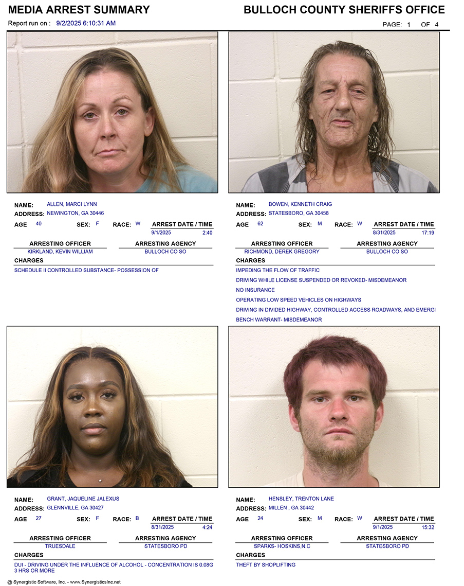 These records are matters of public information provided by the Bulloch County Sheriff’s Office. Booking reports are details of arrests only. All persons below are considered to be innocent unless proven otherwise in a court of law.