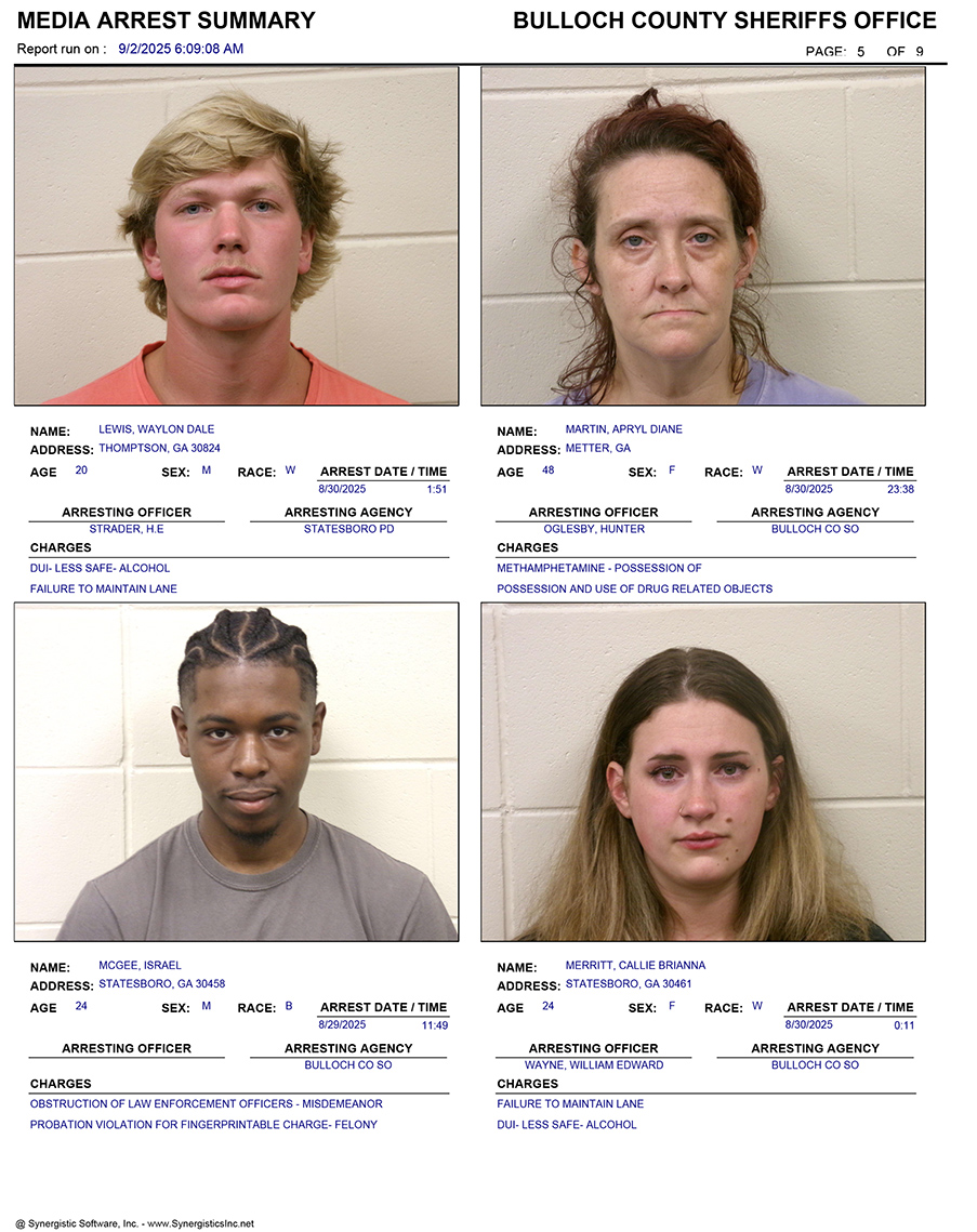 These records are matters of public information provided by the Bulloch County Sheriff’s Office. Booking reports are details of arrests only. All persons below are considered to be innocent unless proven otherwise in a court of law.