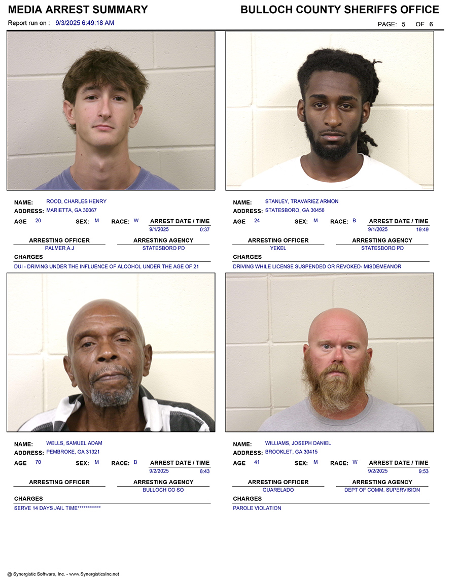 These records are matters of public information provided by the Bulloch County Sheriff’s Office. Booking reports are details of arrests only. All persons below are considered to be innocent unless proven otherwise in a court of law.
