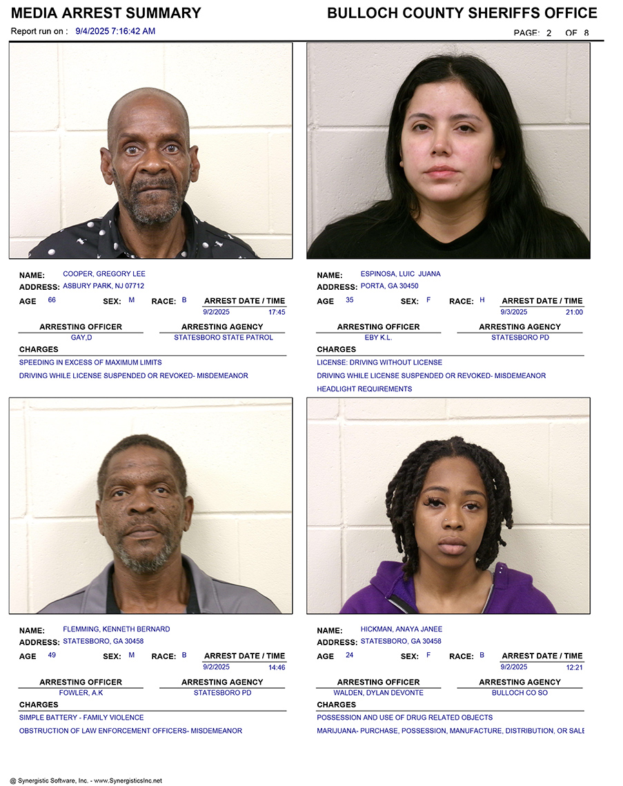These records are matters of public information provided by the Bulloch County Sheriff’s Office. Booking reports are details of arrests only. All persons below are considered to be innocent unless proven otherwise in a court of law.