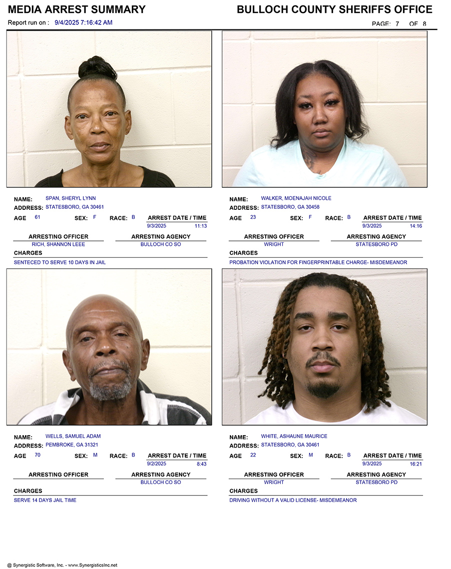 These records are matters of public information provided by the Bulloch County Sheriff’s Office. Booking reports are details of arrests only. All persons below are considered to be innocent unless proven otherwise in a court of law.