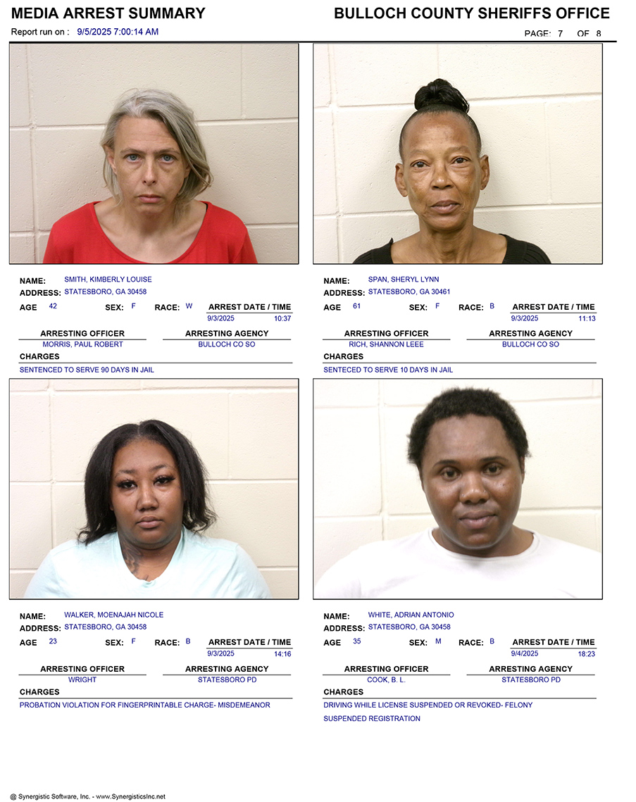 These records are matters of public information provided by the Bulloch County Sheriff’s Office. Booking reports are details of arrests only. All persons below are considered to be innocent unless proven otherwise in a court of law.