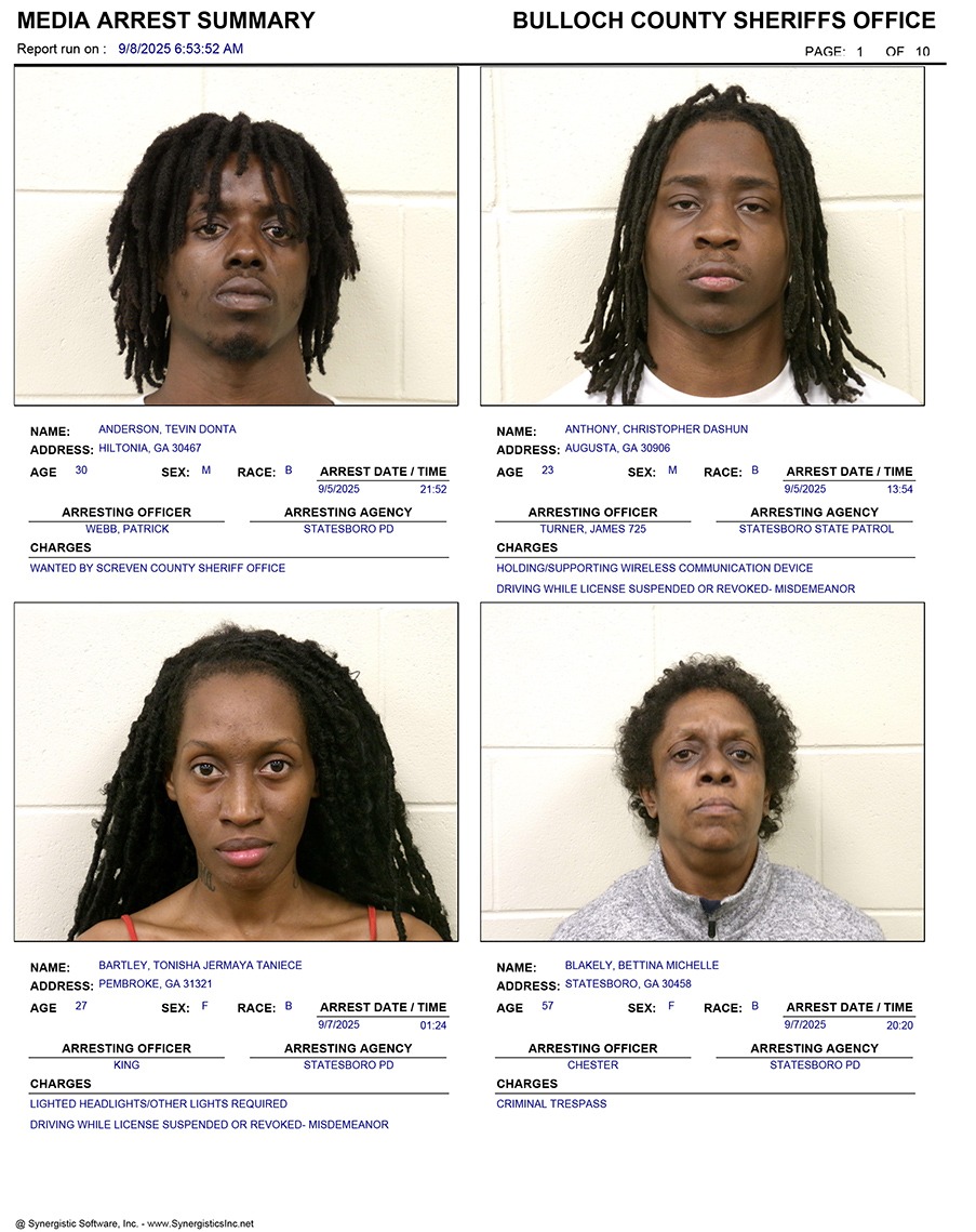 These records are matters of public information provided by the Bulloch County Sheriff’s Office. Booking reports are details of arrests only. All persons below are considered to be innocent unless proven otherwise in a court of law.