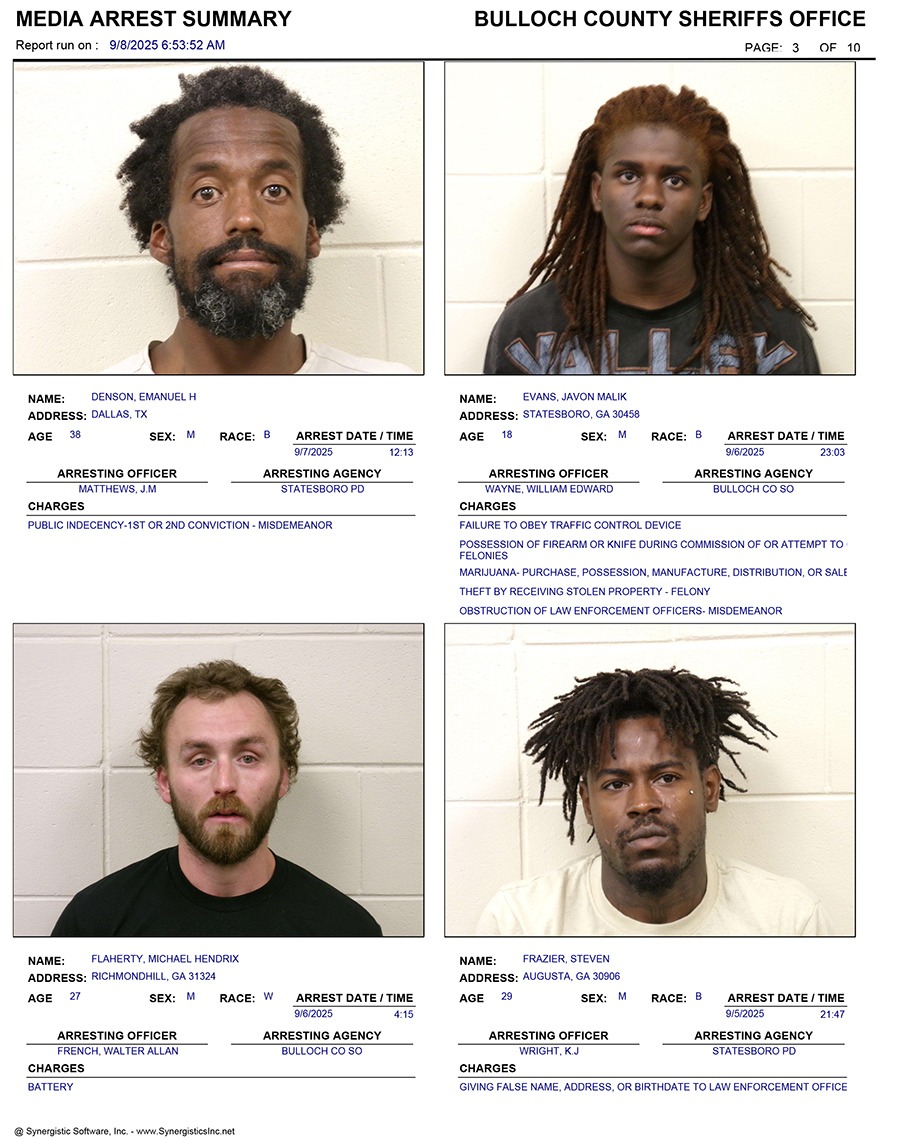 These records are matters of public information provided by the Bulloch County Sheriff’s Office. Booking reports are details of arrests only. All persons below are considered to be innocent unless proven otherwise in a court of law.