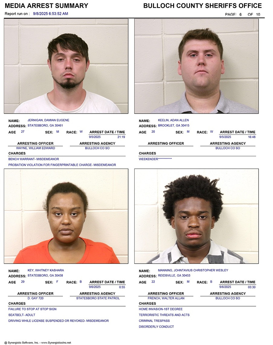 These records are matters of public information provided by the Bulloch County Sheriff’s Office. Booking reports are details of arrests only. All persons below are considered to be innocent unless proven otherwise in a court of law.