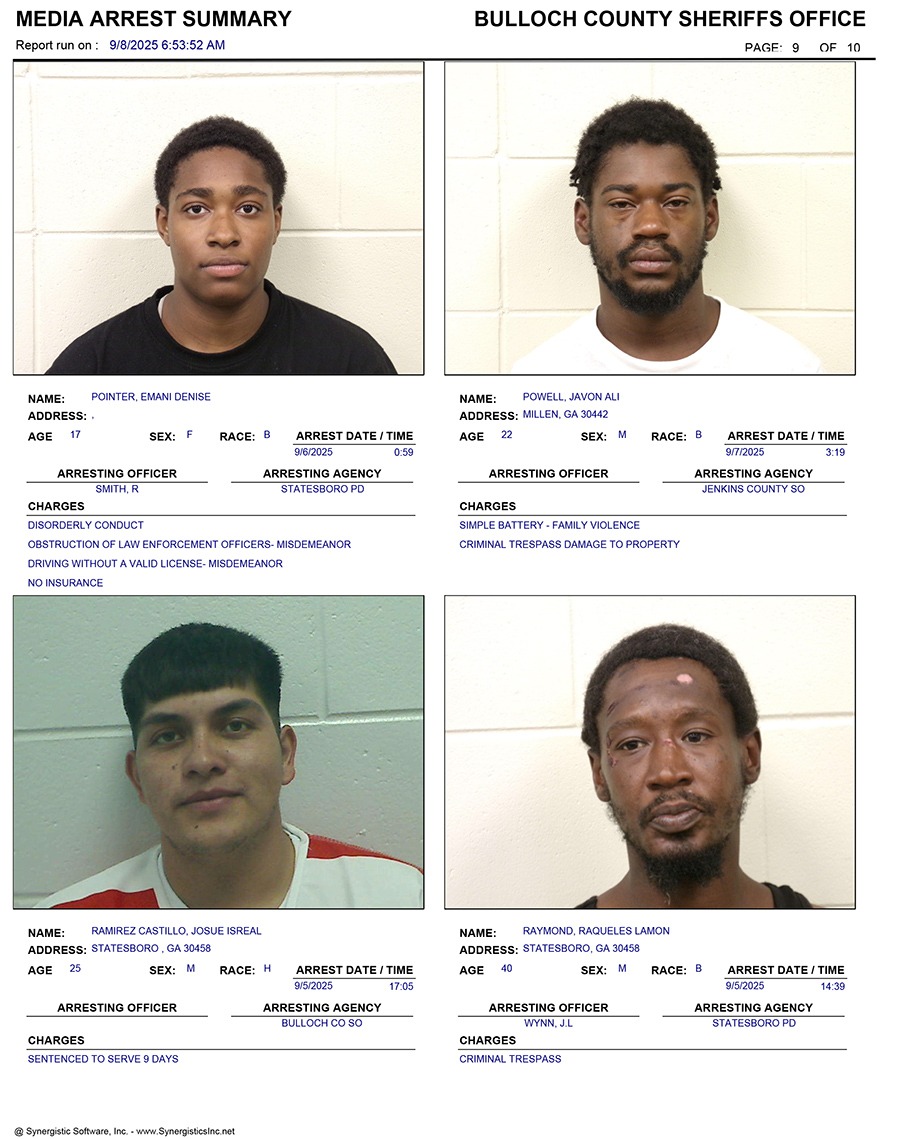 These records are matters of public information provided by the Bulloch County Sheriff’s Office. Booking reports are details of arrests only. All persons below are considered to be innocent unless proven otherwise in a court of law.