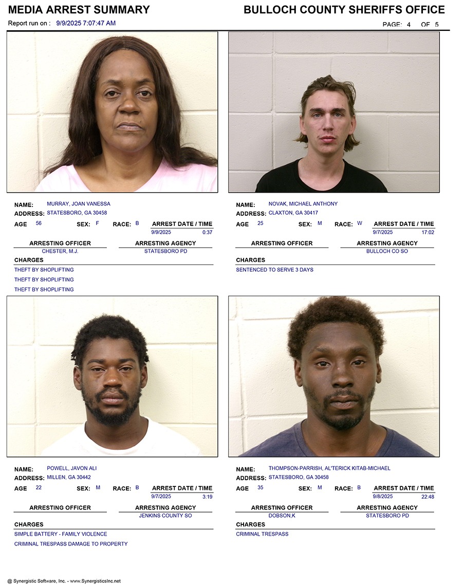 These records are matters of public information provided by the Bulloch County Sheriff’s Office. Booking reports are details of arrests only. All persons below are considered to be innocent unless proven otherwise in a court of law.
