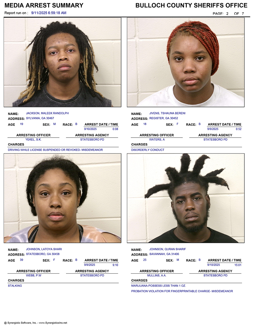 These records are matters of public information provided by the Bulloch County Sheriff’s Office. Booking reports are details of arrests only. All persons below are considered to be innocent unless proven otherwise in a court of law.
