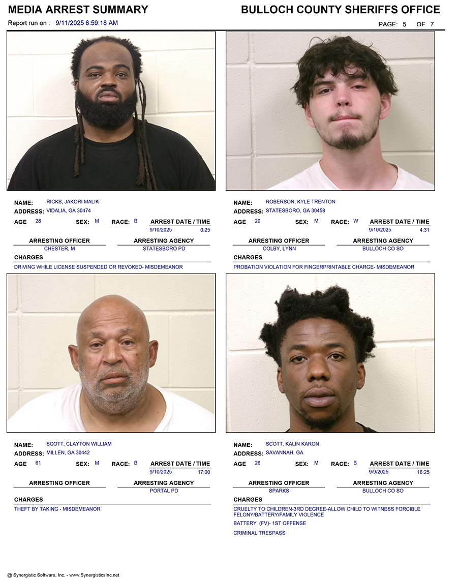 These records are matters of public information provided by the Bulloch County Sheriff’s Office. Booking reports are details of arrests only. All persons below are considered to be innocent unless proven otherwise in a court of law.