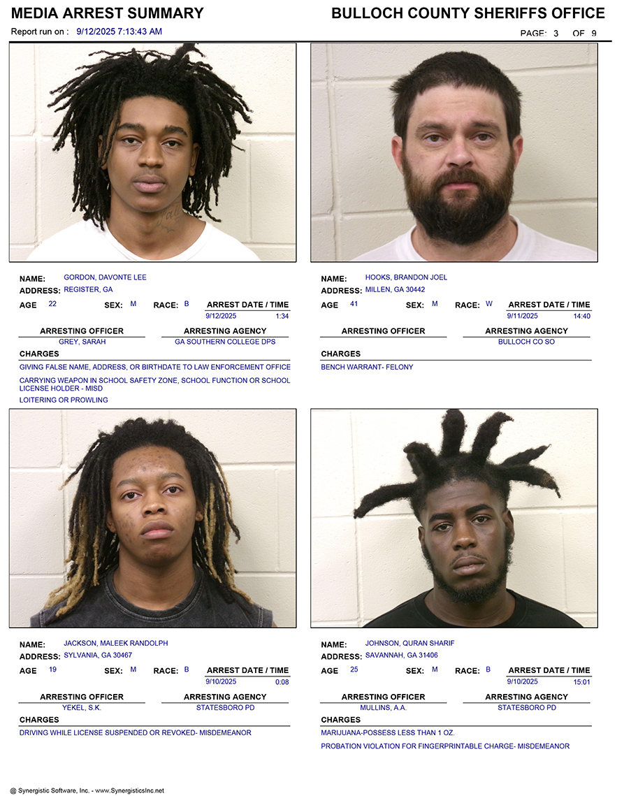 These records are matters of public information provided by the Bulloch County Sheriff’s Office. Booking reports are details of arrests only. All persons below are considered to be innocent unless proven otherwise in a court of law.
