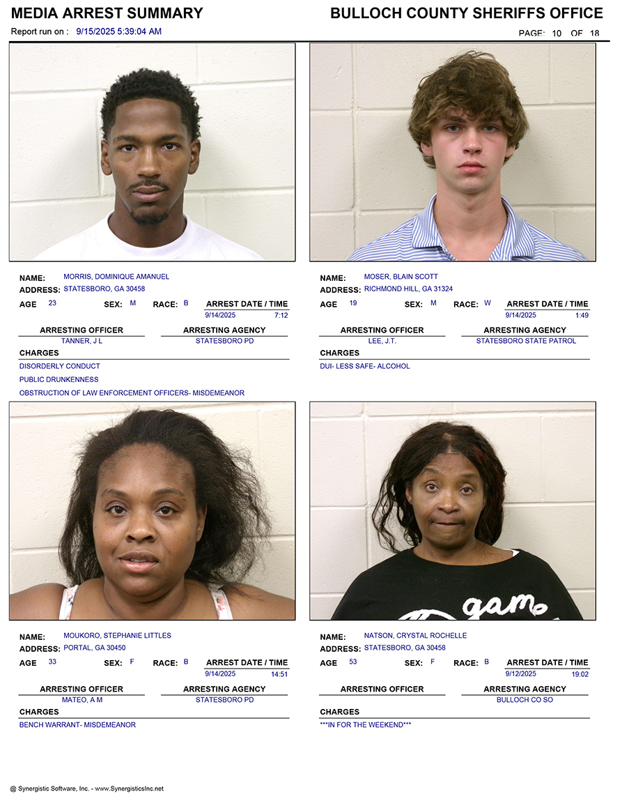 These records are matters of public information provided by the Bulloch County Sheriff’s Office. Booking reports are details of arrests only. All persons below are considered to be innocent unless proven otherwise in a court of law.