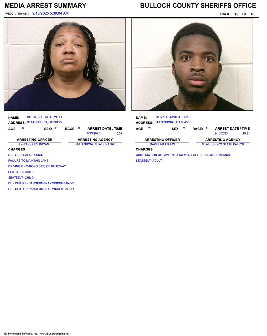 These records are matters of public information provided by the Bulloch County Sheriff’s Office. Booking reports are details of arrests only. All persons below are considered to be innocent unless proven otherwise in a court of law.