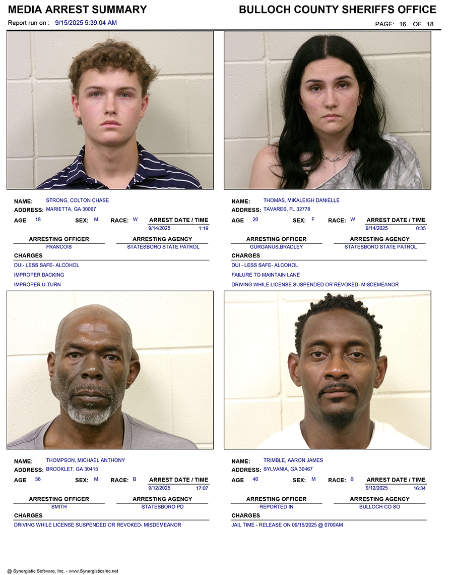 These records are matters of public information provided by the Bulloch County Sheriff’s Office. Booking reports are details of arrests only. All persons below are considered to be innocent unless proven otherwise in a court of law.