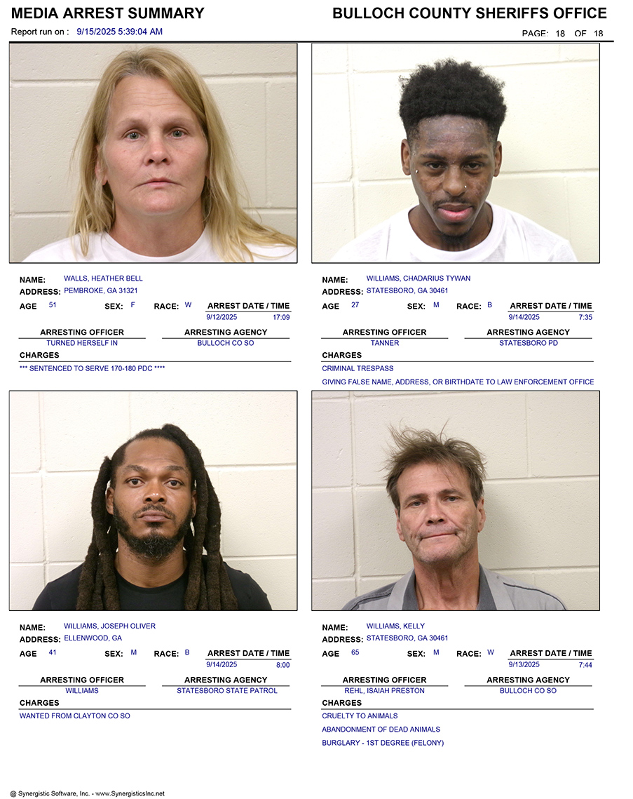 These records are matters of public information provided by the Bulloch County Sheriff’s Office. Booking reports are details of arrests only. All persons below are considered to be innocent unless proven otherwise in a court of law.