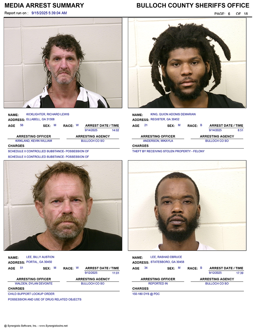 These records are matters of public information provided by the Bulloch County Sheriff’s Office. Booking reports are details of arrests only. All persons below are considered to be innocent unless proven otherwise in a court of law.