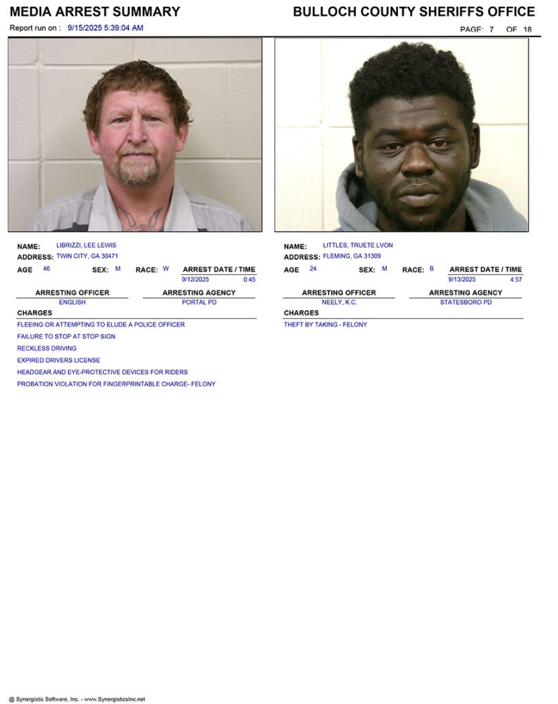 These records are matters of public information provided by the Bulloch County Sheriff’s Office. Booking reports are details of arrests only. All persons below are considered to be innocent unless proven otherwise in a court of law.