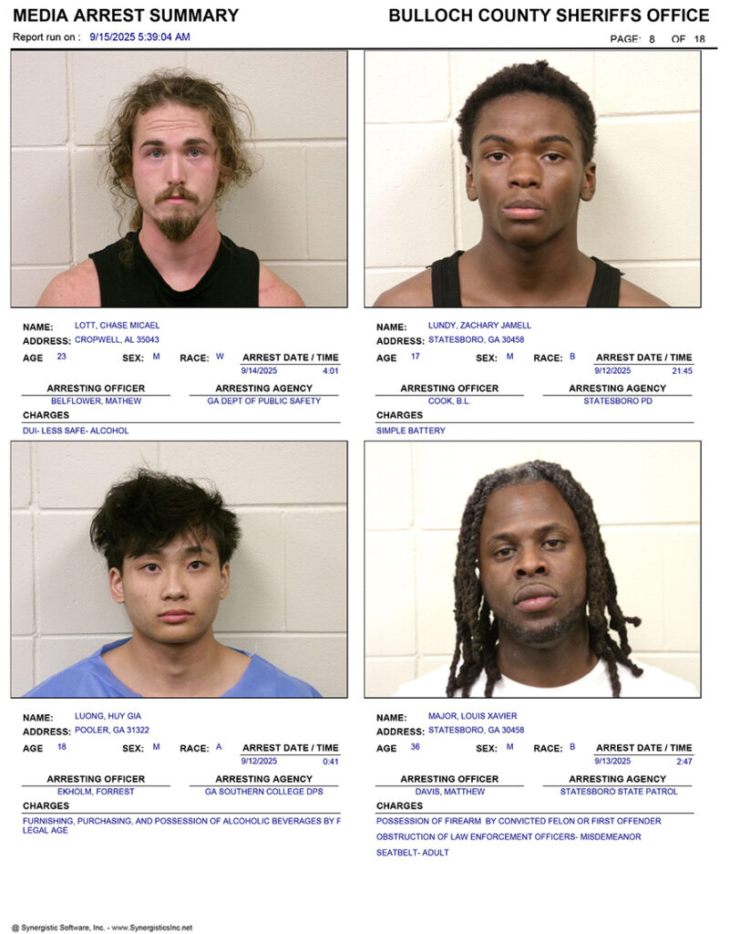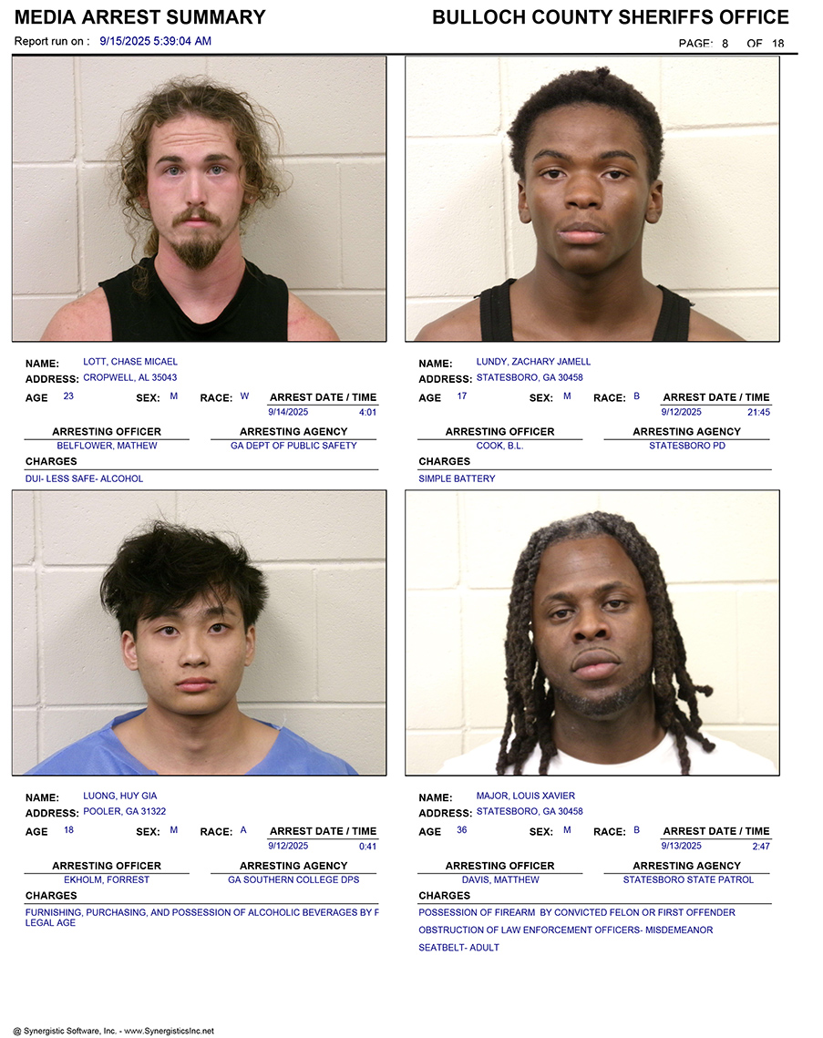 These records are matters of public information provided by the Bulloch County Sheriff’s Office. Booking reports are details of arrests only. All persons below are considered to be innocent unless proven otherwise in a court of law.