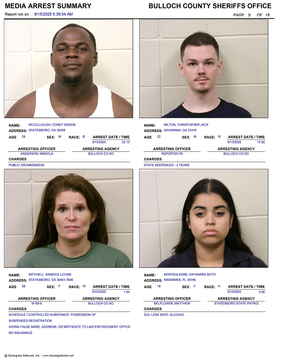 These records are matters of public information provided by the Bulloch County Sheriff’s Office. Booking reports are details of arrests only. All persons below are considered to be innocent unless proven otherwise in a court of law.