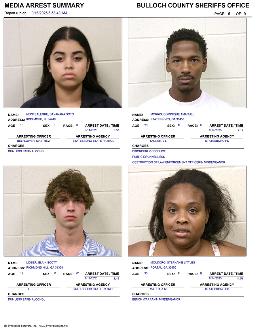 These records are matters of public information provided by the Bulloch County Sheriff’s Office. Booking reports are details of arrests only. All persons below are considered to be innocent unless proven otherwise in a court of law.