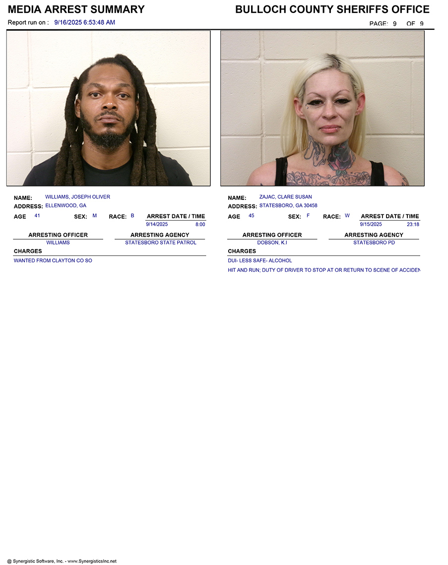 These records are matters of public information provided by the Bulloch County Sheriff’s Office. Booking reports are details of arrests only. All persons below are considered to be innocent unless proven otherwise in a court of law.