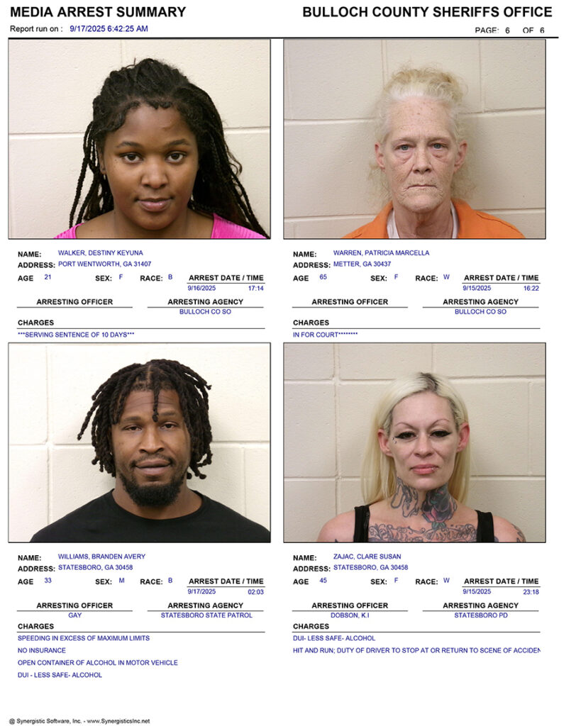 These records are matters of public information provided by the Bulloch County Sheriff’s Office. Booking reports are details of arrests only. All persons below are considered to be innocent unless proven otherwise in a court of law.