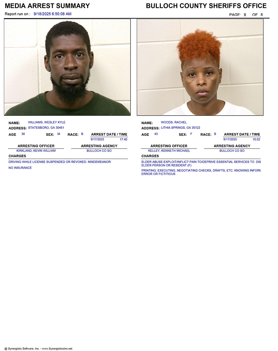 These records are matters of public information provided by the Bulloch County Sheriff’s Office. Booking reports are details of arrests only. All persons below are considered to be innocent unless proven otherwise in a court of law.