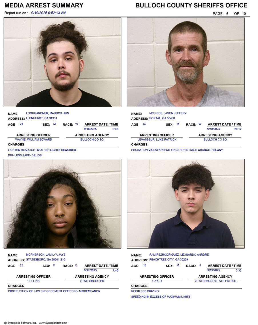 These records are matters of public information provided by the Bulloch County Sheriff’s Office. Booking reports are details of arrests only. All persons below are considered to be innocent unless proven otherwise in a court of law.