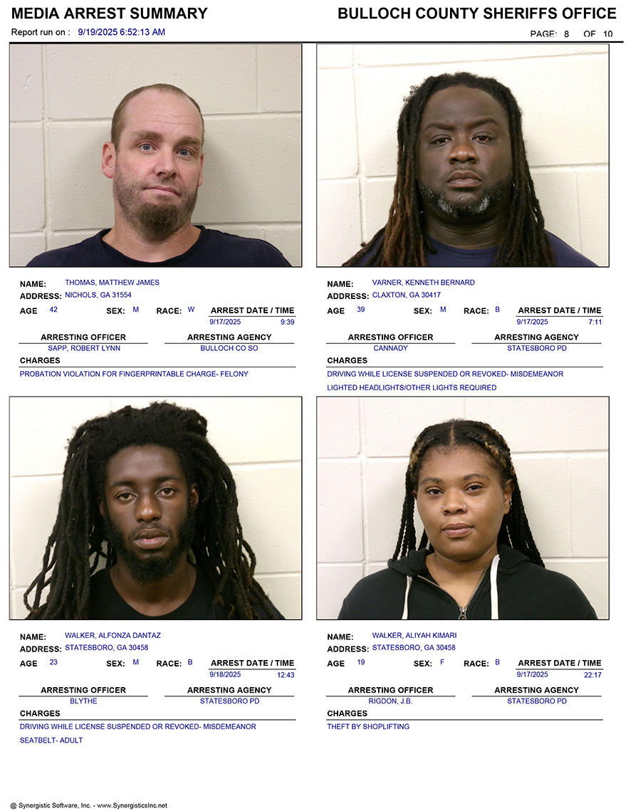 These records are matters of public information provided by the Bulloch County Sheriff’s Office. Booking reports are details of arrests only. All persons below are considered to be innocent unless proven otherwise in a court of law.