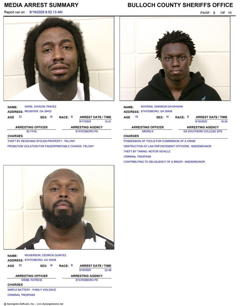 These records are matters of public information provided by the Bulloch County Sheriff’s Office. Booking reports are details of arrests only. All persons below are considered to be innocent unless proven otherwise in a court of law.
