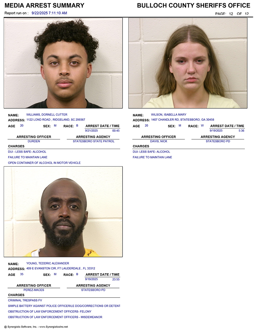 These records are matters of public information provided by the Bulloch County Sheriff’s Office. Booking reports are details of arrests only. All persons below are considered to be innocent unless proven otherwise in a court of law.