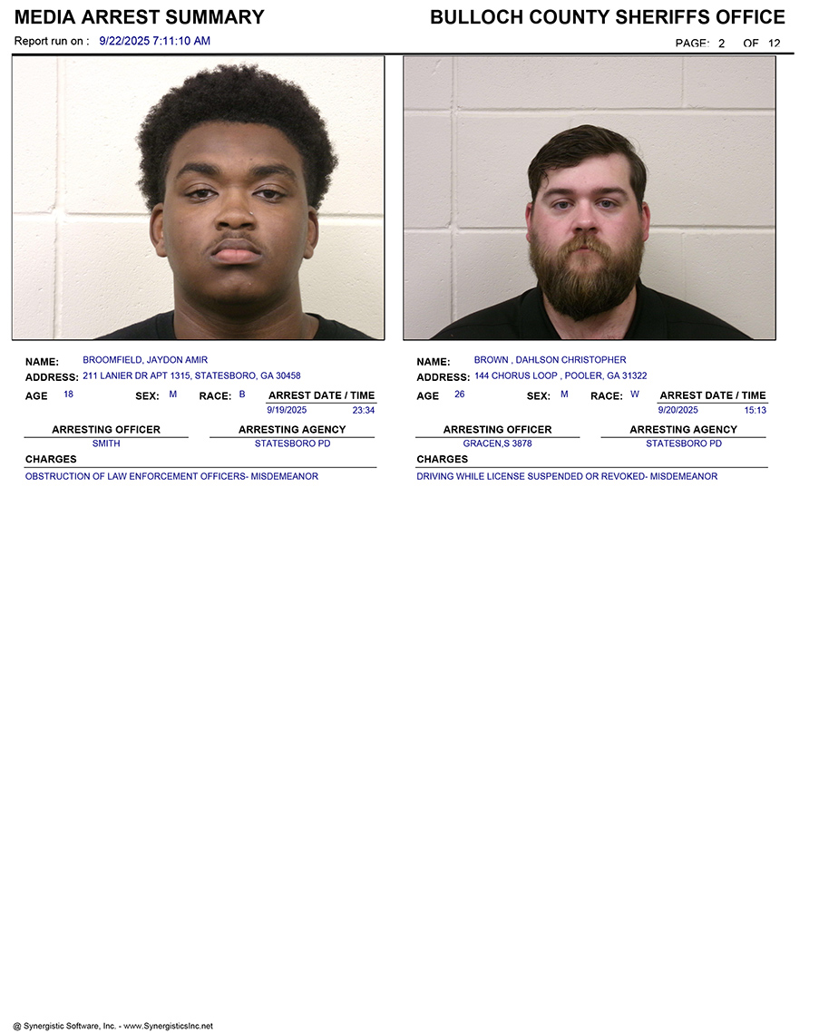 These records are matters of public information provided by the Bulloch County Sheriff’s Office. Booking reports are details of arrests only. All persons below are considered to be innocent unless proven otherwise in a court of law.