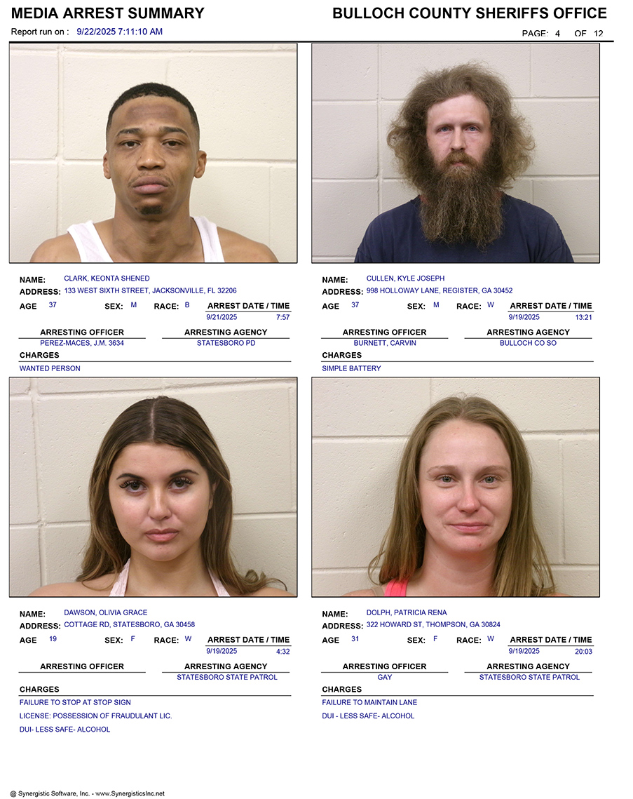 These records are matters of public information provided by the Bulloch County Sheriff’s Office. Booking reports are details of arrests only. All persons below are considered to be innocent unless proven otherwise in a court of law.