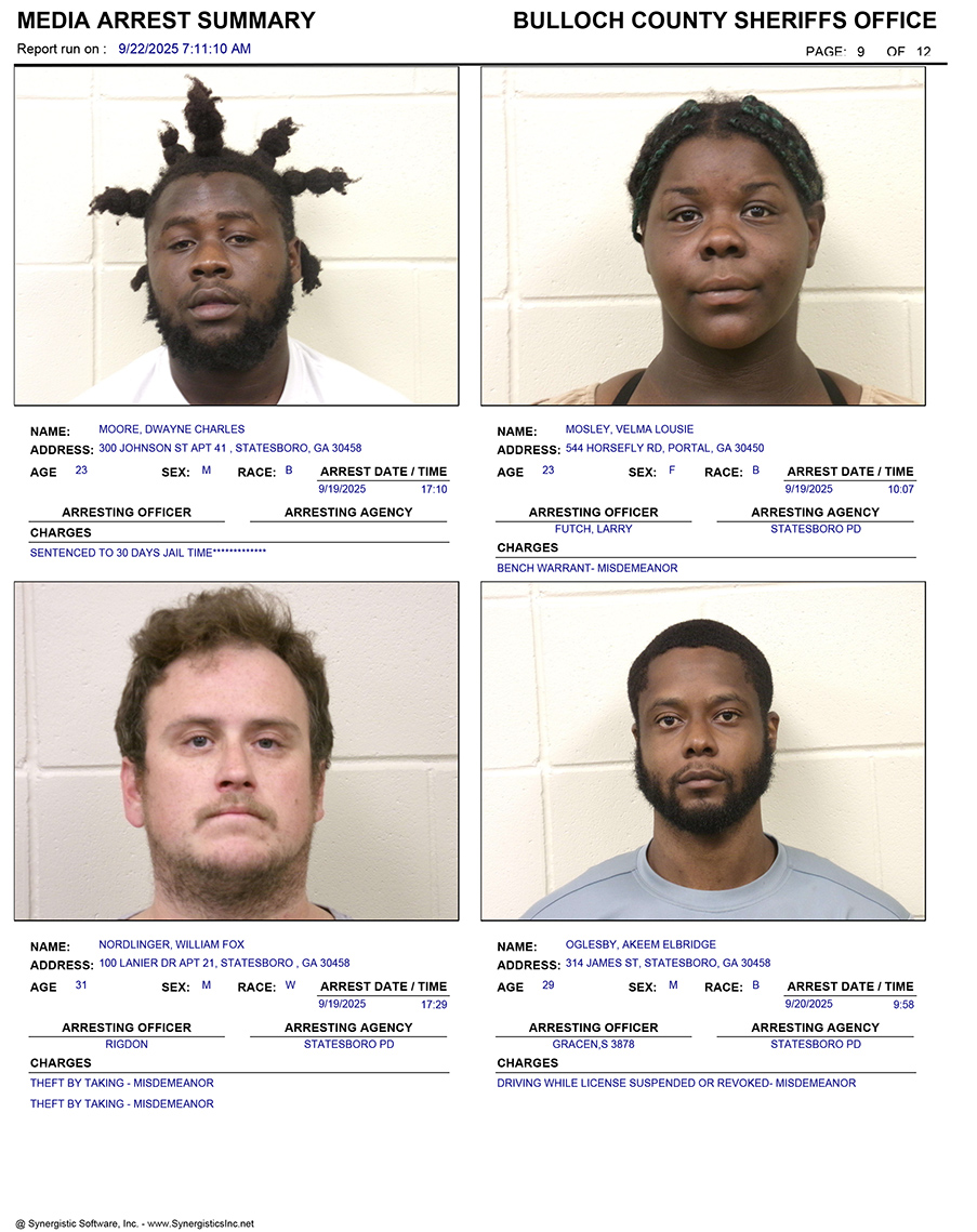 These records are matters of public information provided by the Bulloch County Sheriff’s Office. Booking reports are details of arrests only. All persons below are considered to be innocent unless proven otherwise in a court of law.