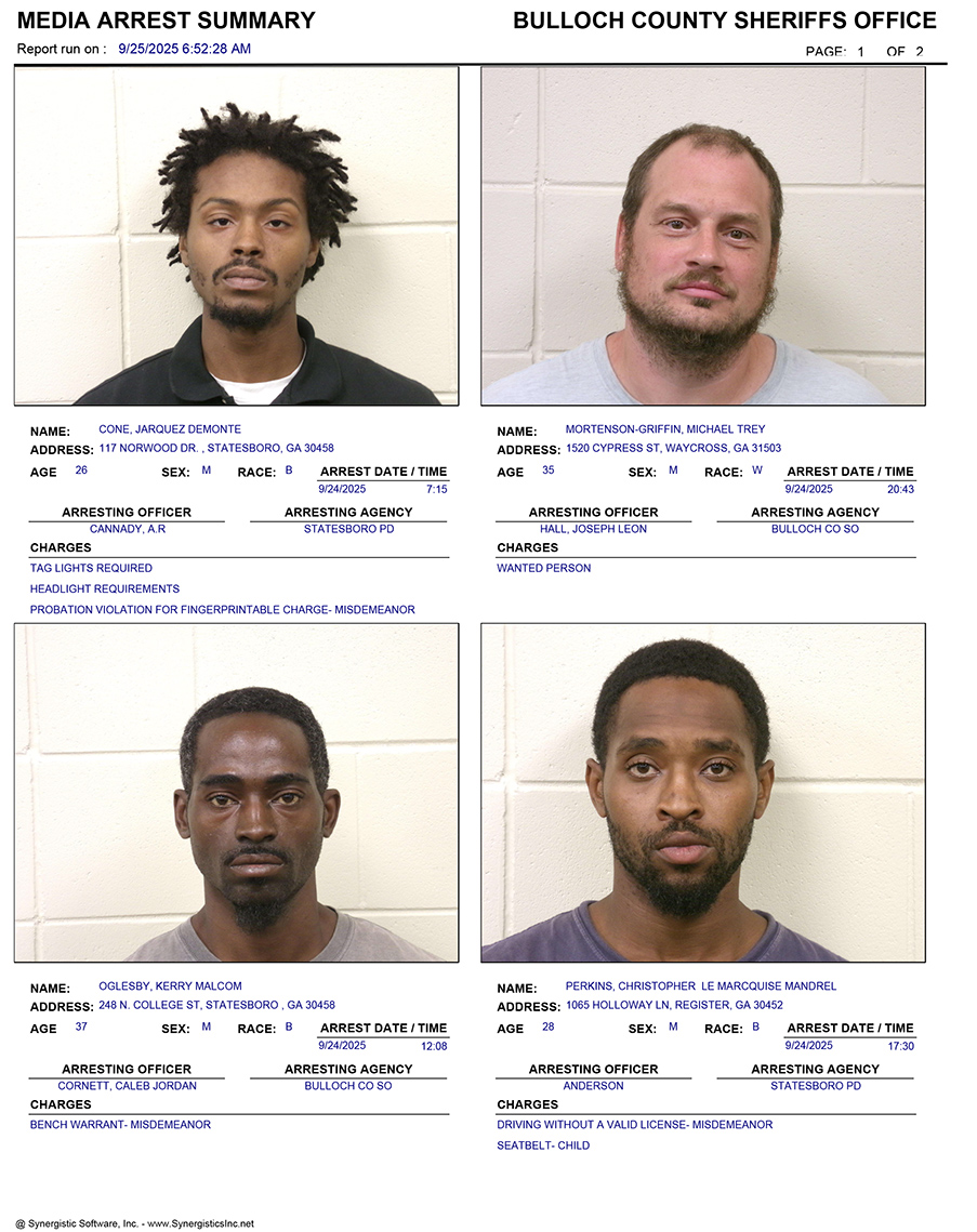 These records are matters of public information provided by the Bulloch County Sheriff’s Office. Booking reports are details of arrests only. All persons below are considered to be innocent unless proven otherwise in a court of law.