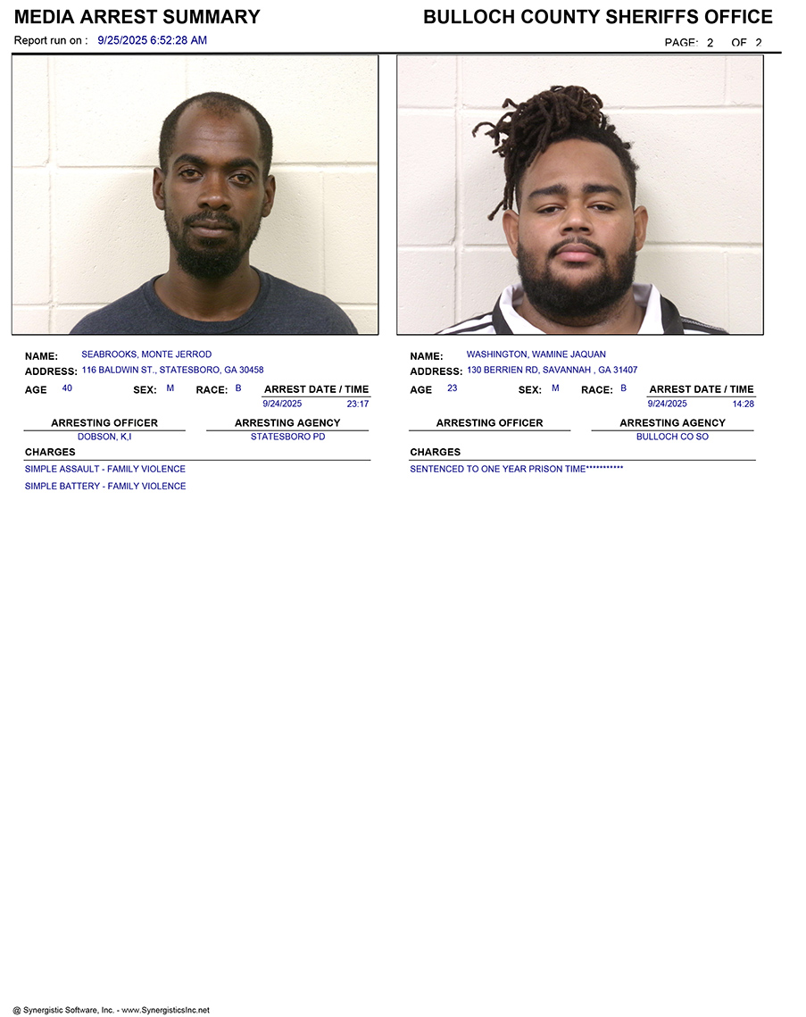 These records are matters of public information provided by the Bulloch County Sheriff’s Office. Booking reports are details of arrests only. All persons below are considered to be innocent unless proven otherwise in a court of law.