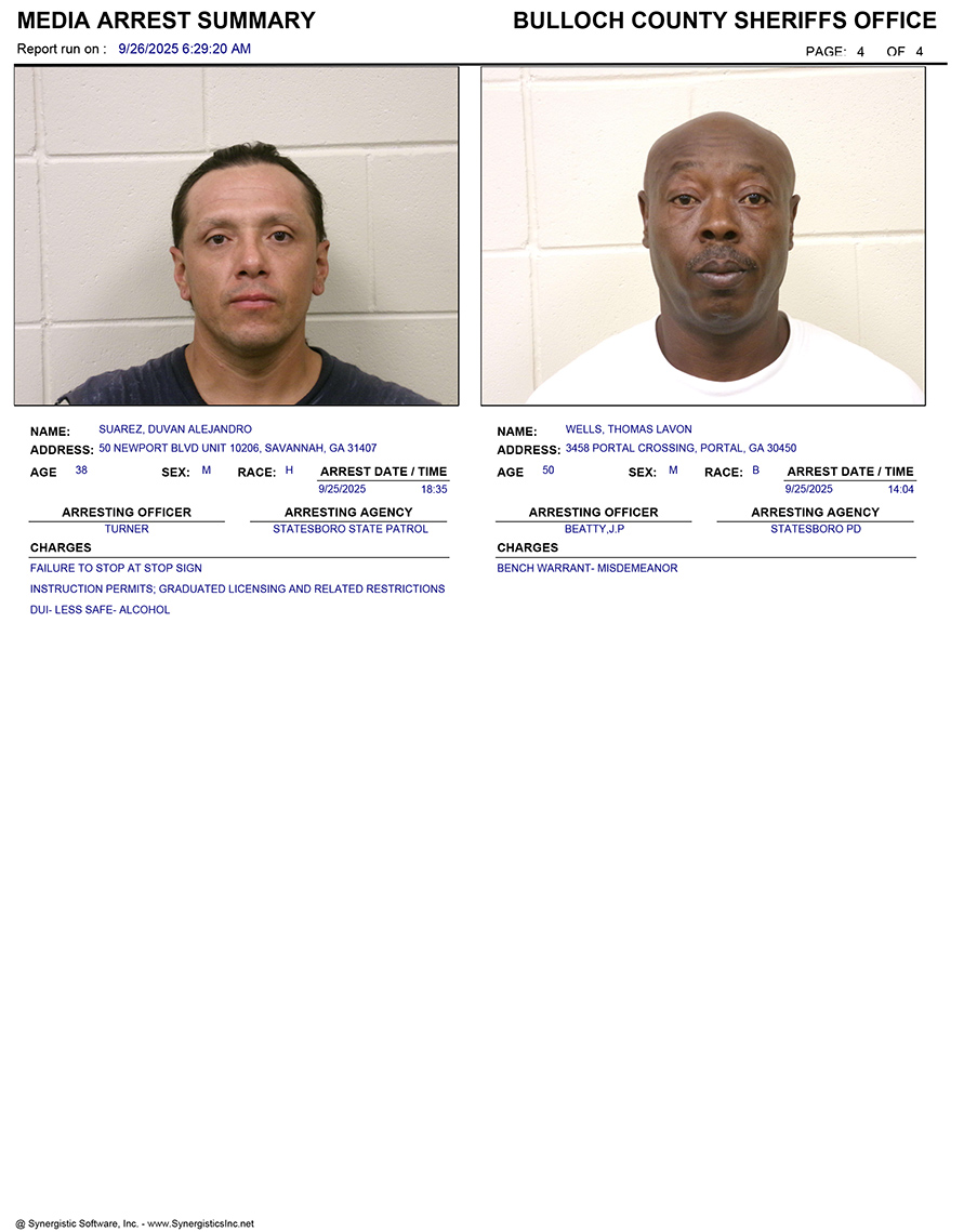 These records are matters of public information provided by the Bulloch County Sheriff’s Office. Booking reports are details of arrests only. All persons below are considered to be innocent unless proven otherwise in a court of law.