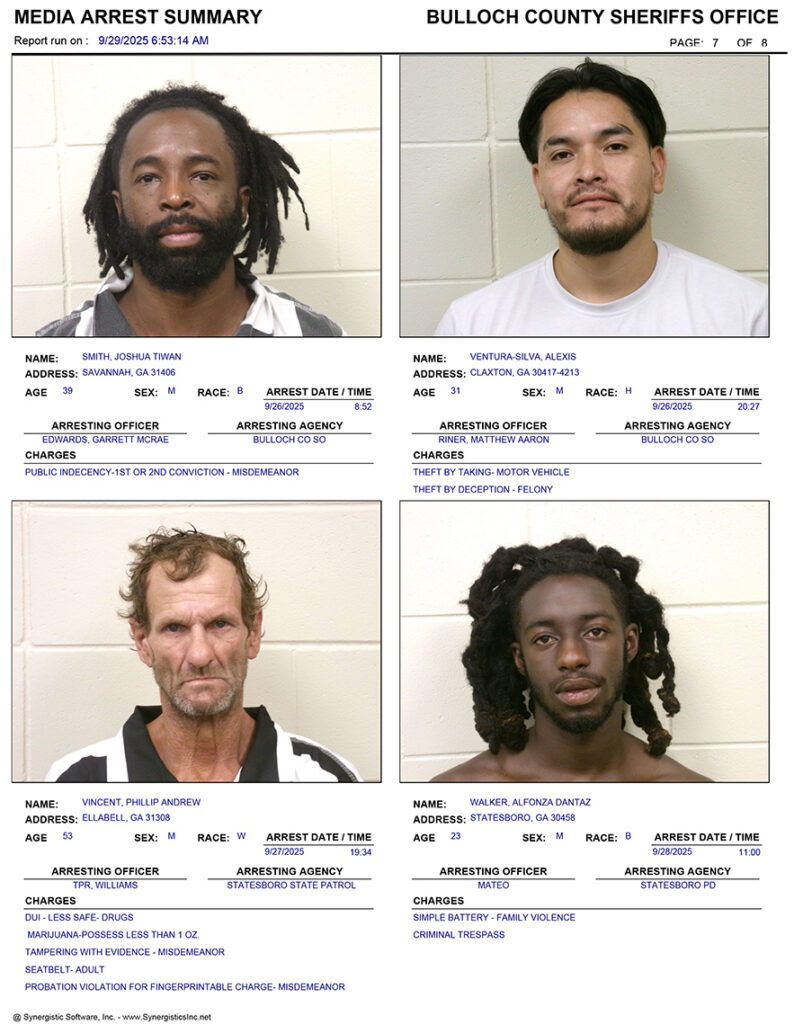 These records are matters of public information provided by the Bulloch County Sheriff’s Office. Booking reports are details of arrests only. All persons below are considered to be innocent unless proven otherwise in a court of law.