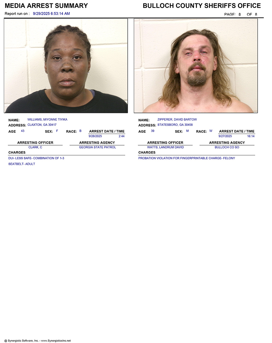 These records are matters of public information provided by the Bulloch County Sheriff’s Office. Booking reports are details of arrests only. All persons below are considered to be innocent unless proven otherwise in a court of law.