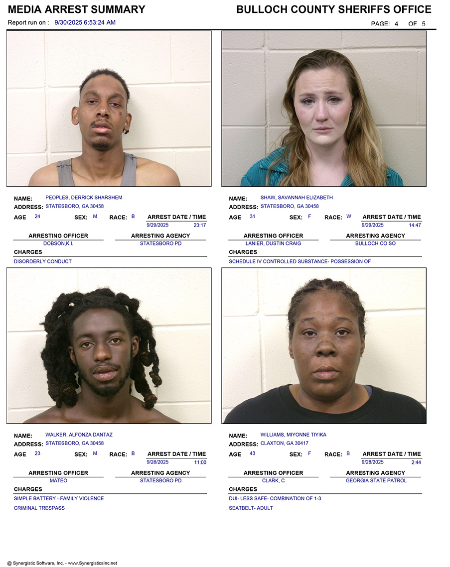 These records are matters of public information provided by the Bulloch County Sheriff’s Office. Booking reports are details of arrests only. All persons below are considered to be innocent unless proven otherwise in a court of law.