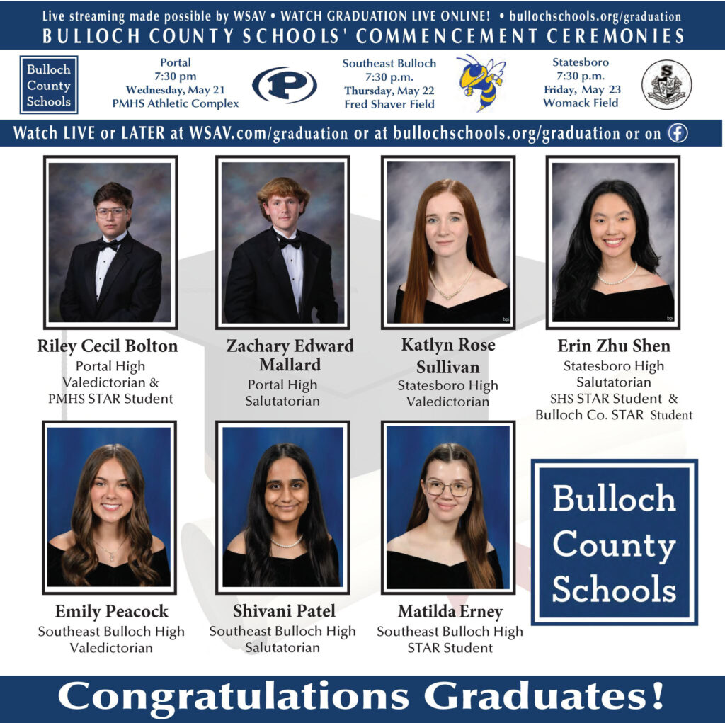 Have a family member or friend graduating, but can’t make it to the ceremony? Each ceremony can be watched live on Bulloch County Schools’ website at the scheduled times. They will also be available to watch via live stream and via video replay on WSAV’s website, WSAV’s Facebook page, and on Bulloch County School’s Facebook page.