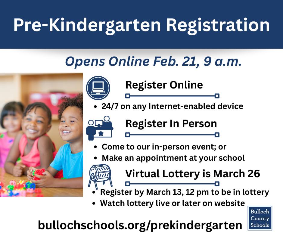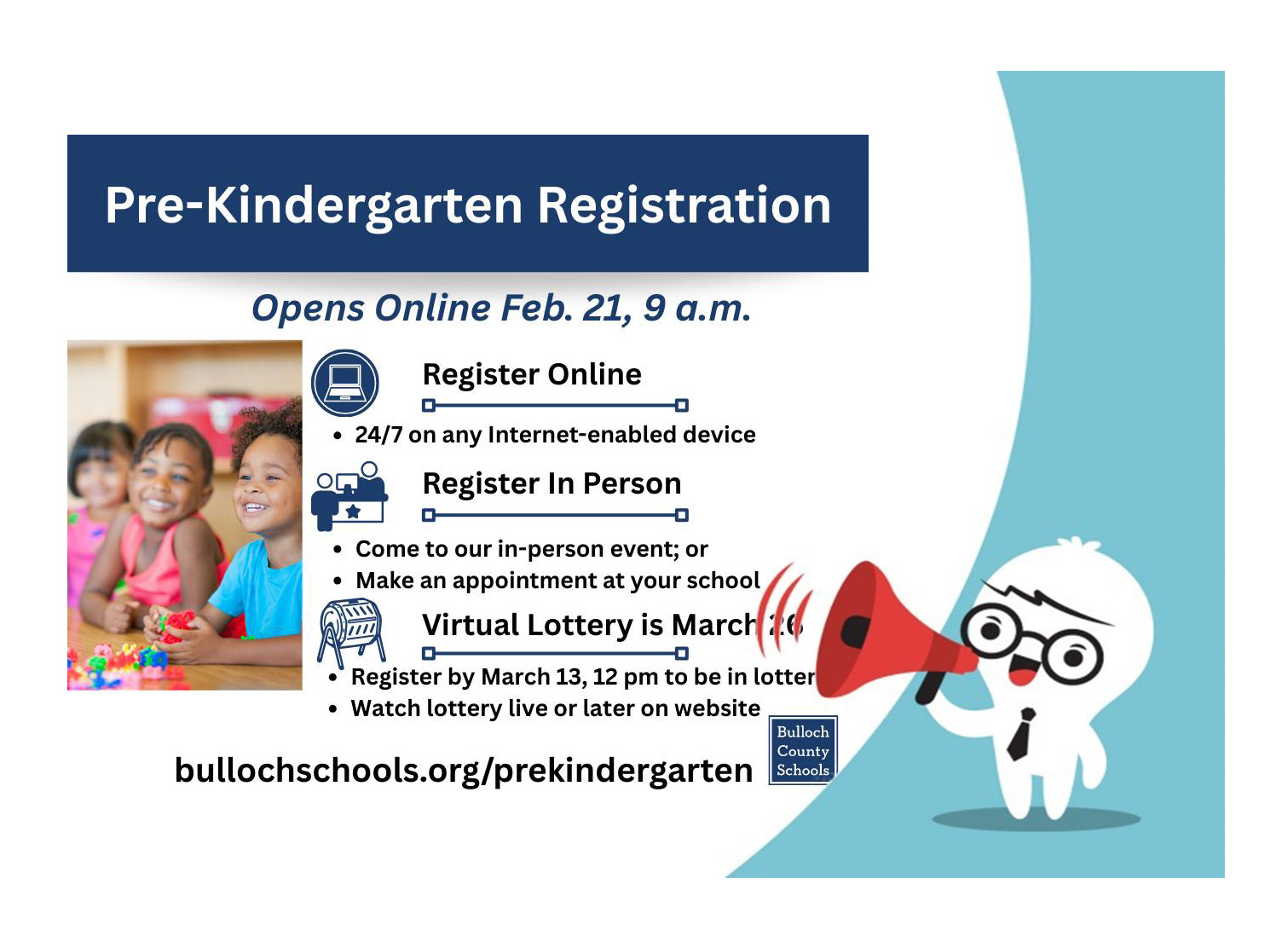 Bulloch County Schools’ Pre-Kindergarten registration for the 2026/2027 school year opens online on Feb. 21, at 9 a.m. Visit the Pre-K website for more information and to register.